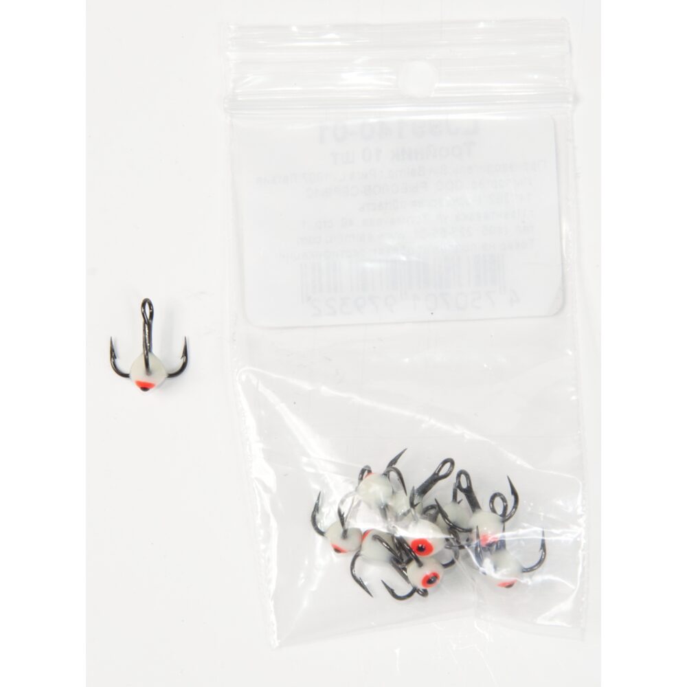 Trijžuburu āķis ar krāsainu pilienu balansieru vai citu ziemas mānekļu aprīkošanai.