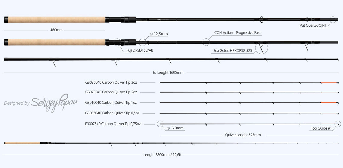 ZEMEX Icon Tournament Feeder is a top-end series of feeder rods designed for professional anglers and those who adore high-quality fishing equipment. The series includes four models that will allow you to successfully play at most European competitions. The ZEMEX Icon Tournament Feeder models, which are 10 and 11ft tall, are perfect for high-speed fishing for small and medium-sized fish at short distances. The 12ft long model with a test weight of up to 75 grams is a universal fishing rod that can be used for catching any medium-sized fish in a wide variety of fishing sessions. Feeder rod ZEMEX Icon Tournament Feeder 12.6 ft with a test of up to 90 grams, has an ultra-fast action, thanks to which this model is perfect for fishing on the current.